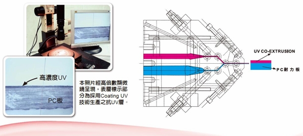 PC板材表层以共挤压方式生产,并在表层涂布抗UV剂。含高浓度长效型之UV涂层表面,可以阻挡紫外线通过,防止板材黄化,延长使用寿命,并较一般板材能长时间保持良好之透视率